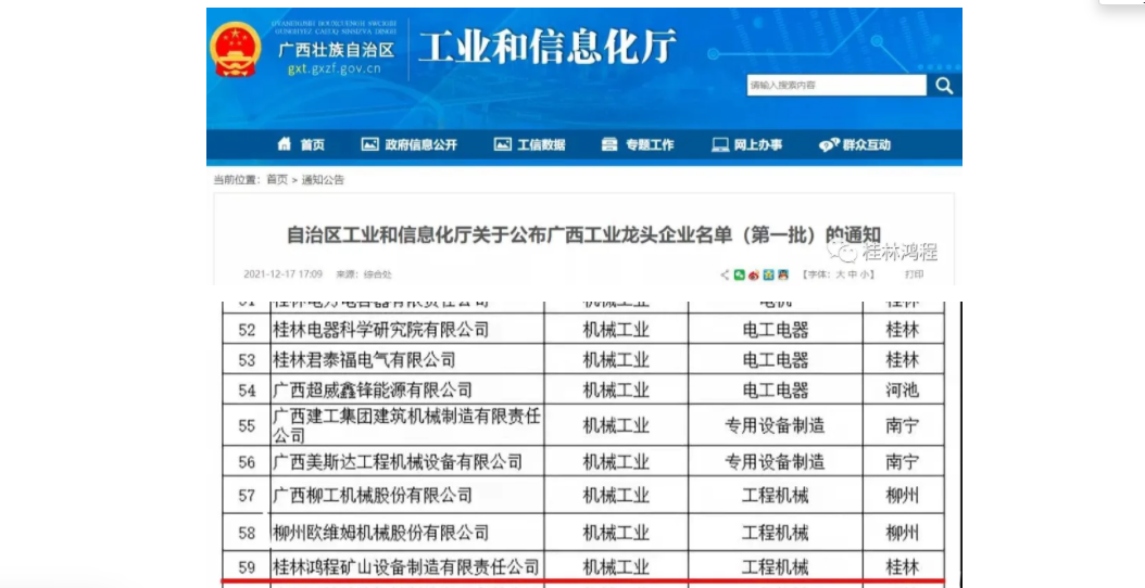 祝桂林鸿程矿山机械公司入选广西工业龙头企业!近日,自治区工业和信息化厅公布第一批广西工业龙头企业名单,共105家企业入选。其中,桂林鸿程矿山机械公司成为桂林21...